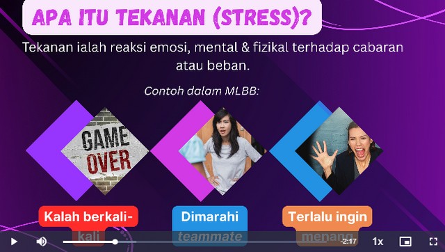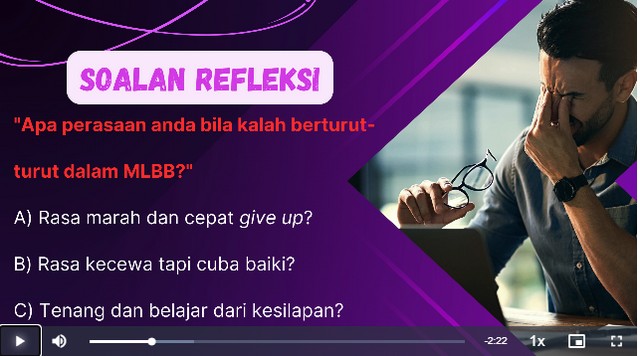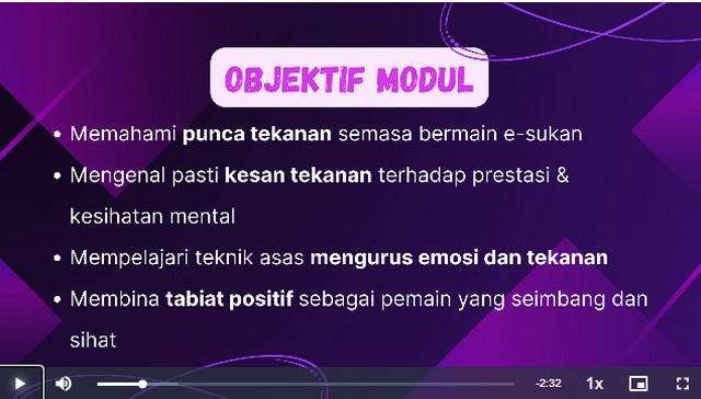 Sepanjang kelas ini berlangsung, peserta melihat video “Mental Kuat, Rank Naik : Urus Tekanan & Emosi Semasa Bermain”. Seterusnya, peserta menonton video tentang objektif modul seperti memahami punca tekanan semasa bermain e-Sukan. Selain itu, peserta menonton video tentang soalan refleksi seperi rasa marah dan cepat give up, rasa kecewa tapi cuba baiki, dan tenang dan belajar daripada kesilapan. Akhir sekali, peserta menonton video tentang apa itu tekanan dalam permainan contohnya kalah berkali-kali, dimarahi teammate dan terlalu ingin menang.