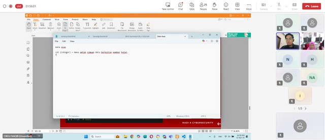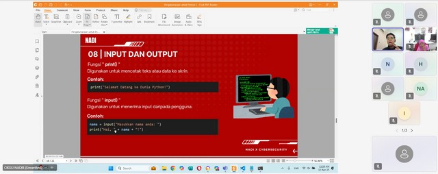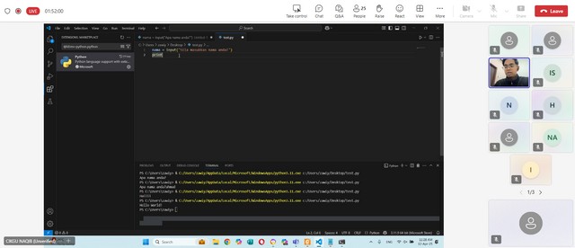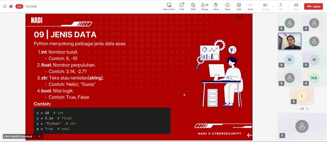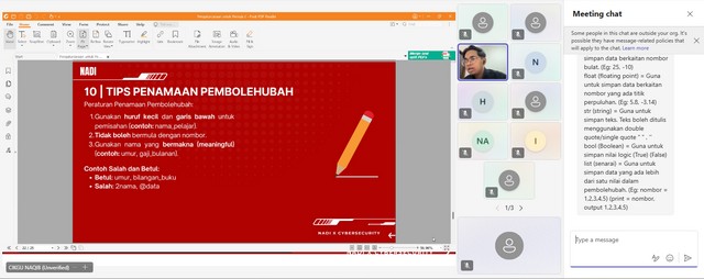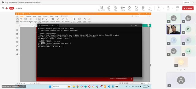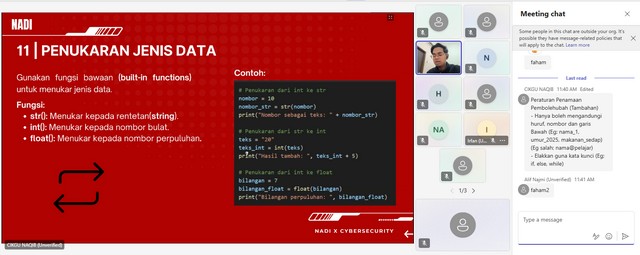 Sepanjang kelas ini berlangsung, cikgu Naqib sebagai wakil kepada Cybersecurity telah memberi penerangan mengenai cara untuk memasukkan nama ke dalam rangkaian Phantom. Selain itu, cikgu Naqib memberi penerangan mengenai input dan ouput iaitu contoh dan fungsi. Seterusnya, cikgu Naqib memberi penerangan mengenai jenis data iaitu int, float, str, dan bool serta contoh seperti x,y,z, dan a. Akhir sekali, cikgu Naqib memberi penerangan mengenai tips penamaan pembolehubah seperti gunakan huruf kevik dan garis bawah untuk pemisah, tidak boleh bermula dengan nombor dan gunama nama yang bermakna.