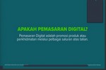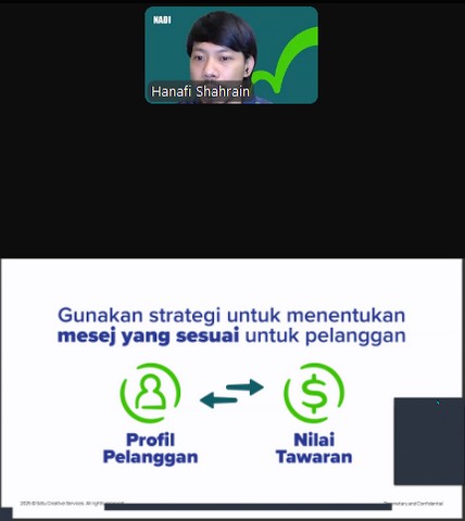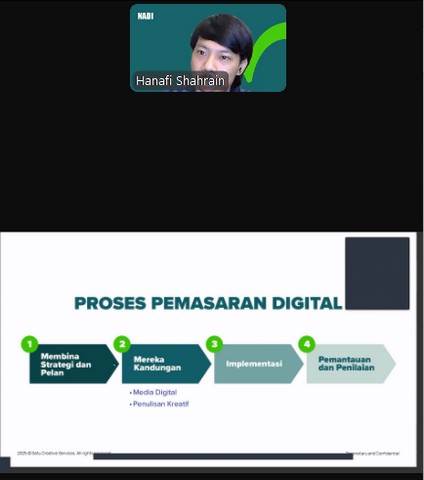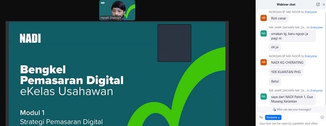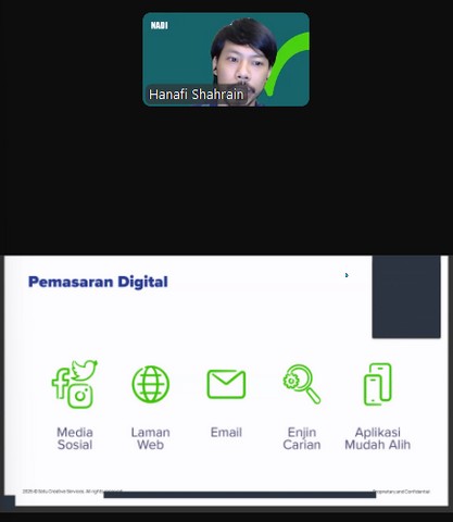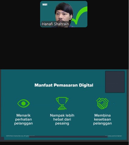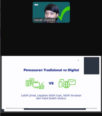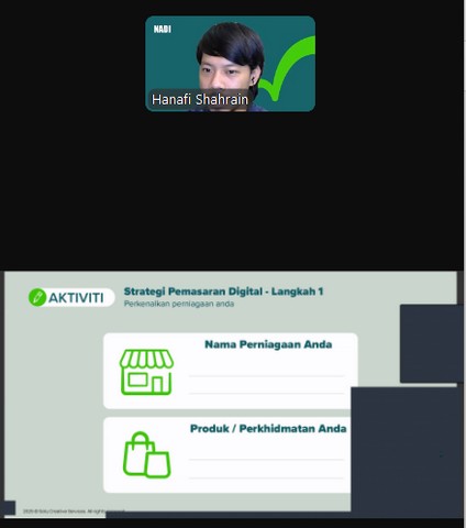 Sepanjang Webinar ini berlangsung, Encik Hanafi Shahrin memberi penerangan mengenai apa itu pemasaran digital. Encik Hanafi Shahrin memberi penerangan mengenai contoh-contoh pemasaran digital seperti media sosial, laman web, email, enjin carian dan aplikasi mudah alih. Seterusnya, Encik Hanafi Shahrin memberi penerangan mengenai perbezaan di antara pemasaran tradisional dan digital. Selain itu, Encik Hanafi Shahrin memberi penerangan mengenai manfaat pemasaran digital seperti menarik perhatian pelanggan, nampak lebih hebat daripada pesaing dan membina kesetiaan pelanggan. Antara lain, Encik Hanafi Shahrin memberi penerangan mengenai proses pemasaran digital antaranya adalah membina strategi dan pelan, mereka kandungan, implementasi dan pemantauan dan pemilaian. Akhir sekali, Encik Hanafi Shahrin memberi penerangan mengenai strategi pemasaran contohnya nama perniagaan, produk / perkhidmatan, profil pelanggan, cabaran, tingkah laku, manfaat dan 3 nilai tawaran.