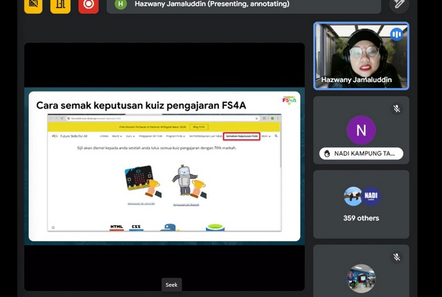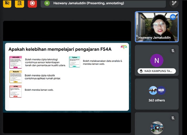 Sepanjang taklimat ini berlangsung, Puan Hazwany Jamaludin sebagai wakil kepada Tiny Techies telah menerangkan apa itu FS4A. Seterusnya, puan Hazwany Jamaludin menerangkan mengenai HTML dan Pyhton. Akhir sekali, puan Hazwany Jamaludin menerangkan mengenai strategi pembelajaran.
