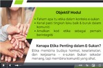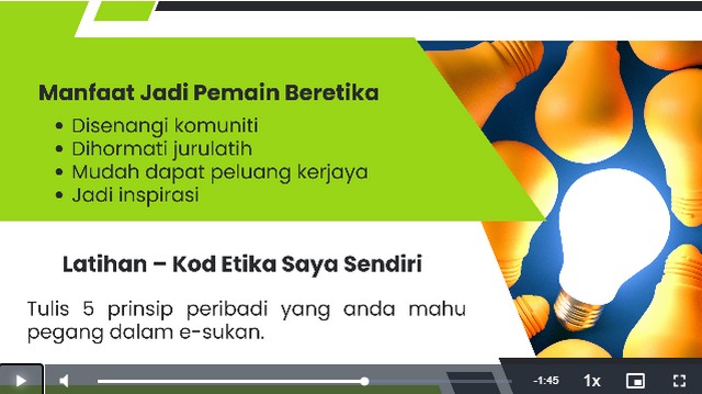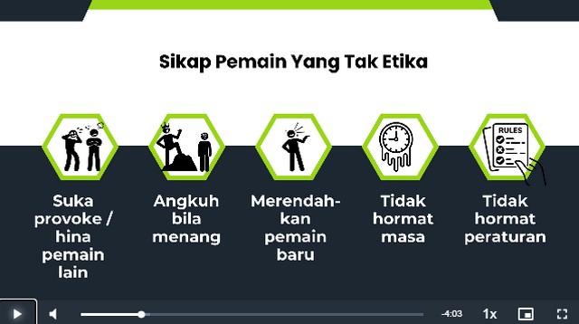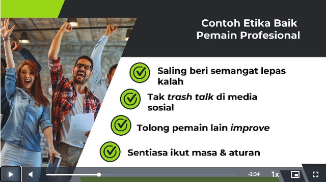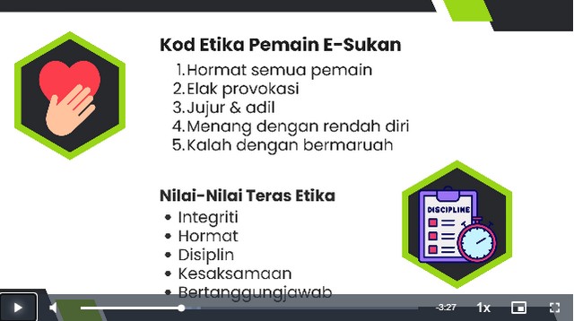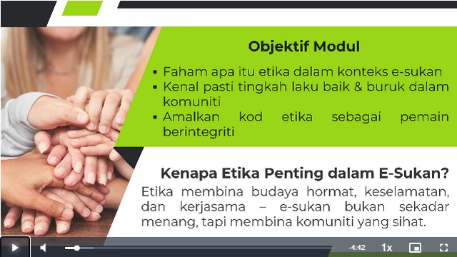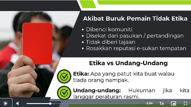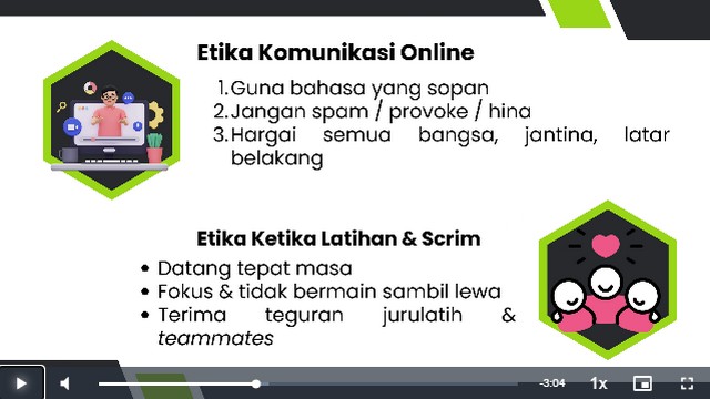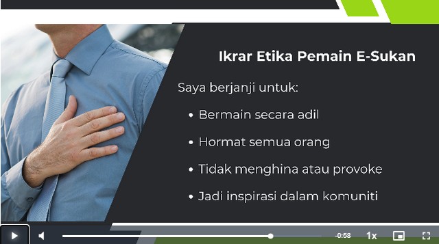Sepanjang kelas ini berlangsung, peserta menonton video Kod Etika Pemain e-Sukan. Seterusnya, peserta menonton video objektif modul dan sebab etika penting dalam e-Sukan. Selain itu, peserta menonton video maksud etika dan masalah etika dalam komuniti e-Sukan . Antara lain, peserta menonton video tentang sikap pemain yang tidak beretika seperti suka provoke, angkuh bila menang, merendahkan pemain baru, tidak hormat masa dan tidak hormat peraturan. Akhir sekali, peserta menonton video akibat buruk tidak beretika seperti dibenci komuniti, disekat daripada pasukan, tidak diberi tajaan dan rosakkan reputasi e-Sukan tempatan.