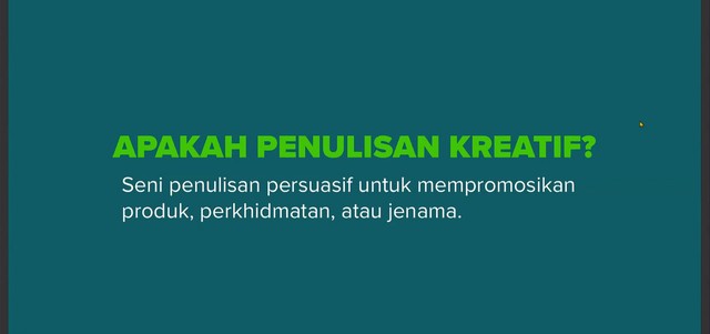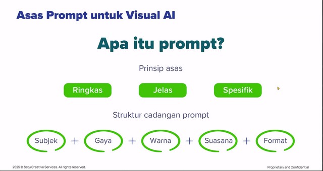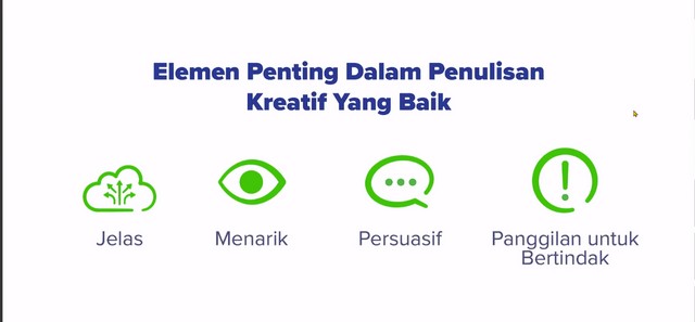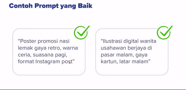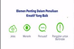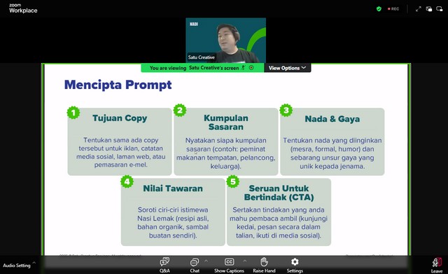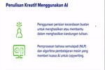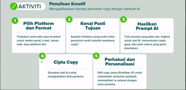 Sepanjang Webinar ini berlangsung, Encik Azhar memberi penerangan mengenai apa itu penulisan kreatif. Encik Azhar memberi penerangan mengenai elemen penting dalam penulisan kreatif yang baik contohnya, jelas, menarik, persuasif dan panggilan untuk bertindak. Selain itu, Encik Azhar memberi penerangan mengenai penulisan kreatif menggunakan AI. Antara lain, Encik Azhar memberi penerangan mengenai mengaplikasikan konsep penulisan copy dengan bantuan Ai seperti memilih platform dan format, kenal pasti tujuan, hasilkan prompt AI, cipta copy dan perhalusi dan personalisasi. Seterusnya, Encik Azhar memberi penerangan mengenai pencipta prompt iaitu tujuan copy, kumpulan sasaran, nada dan gaya, nilai tawaran dan seruan untuk bertindak (CTA). Encik Azhar menerangkan sebab menggunakan AI unuk visual iaitu menjimatkan masa dan kos, mempercepat proses kreatif dan boleh digunakan oleh bukan pereka grafik. Akhir sekali, Encik Azhar memberi penerangan mengenai penyesuaian kandungan visual seperti padankan dengan identiti jenama, perhalusi latar belakang, ekspresi, warna dan gunakan elemen lokal.