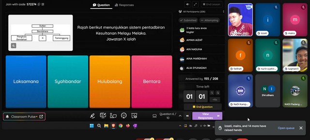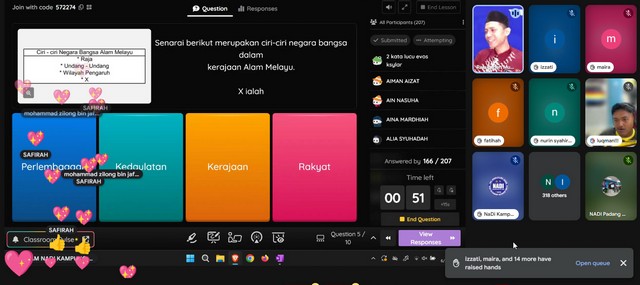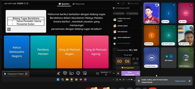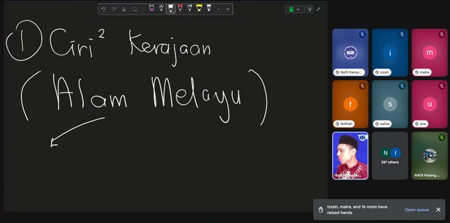 Sepanjang kelas ini berlangsung, guru DiLea memberi penerangan mengenai ciri-ciri Kerajaan Alam Melayu dan ciri-ciri Kerajaan Melayu Melaka. Guru DiLea memberi penerangan mengenai undang-undang yand digunakan oleh sebuah Kerajaan Alam Melayu. Selain itu, guru DiLea memberi penerangan mengenai cara rakyat kerajaan Srivijaya membuktikan kesetiaan kepada pemerintah. Seterusnya, guru DiLea memberi penerangan mengenai sistem pentadbiran Kesultanan Melayu Melaka. Antara lain, guru DiLea memberi penerangan mengenai bidang tugas bendahara seperti Ketua Pendtadbir Utama dan Penasihat Sultan. Akhir sekali, guru DiLea memberi penerangan mengenai Hukum Kanun Melakan dan Undang-Undang Laut Melaka.